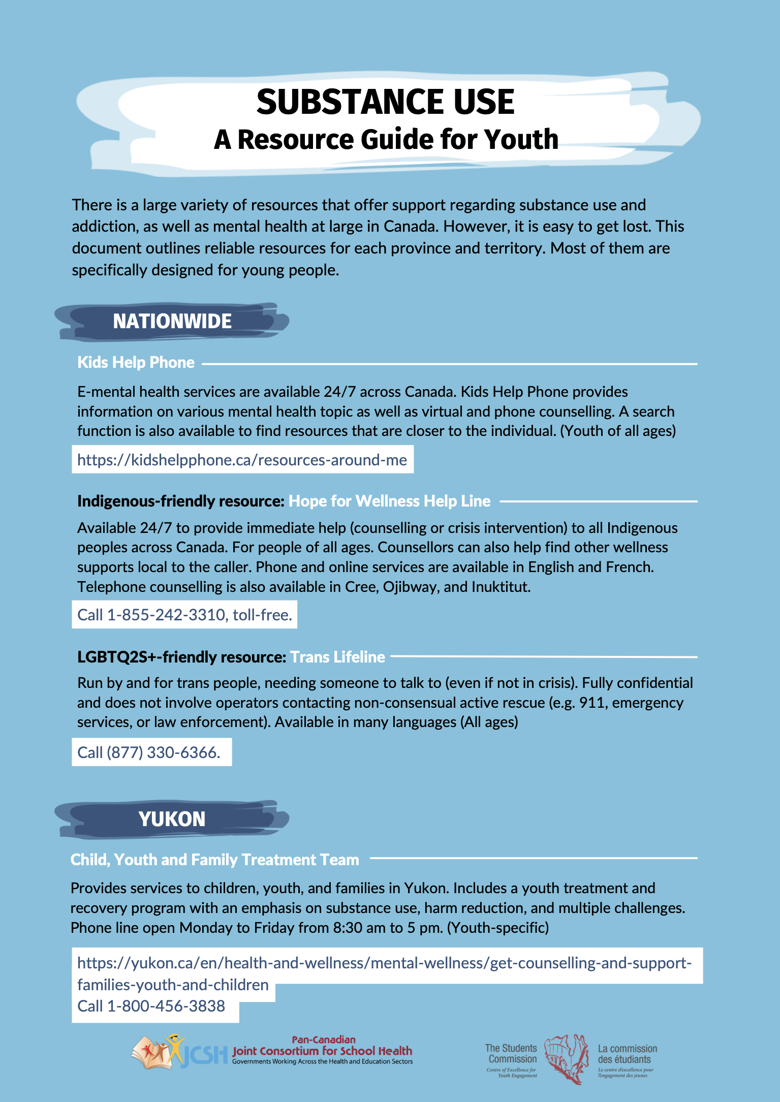 The Students Commission of Canada worked with the Pan-Canadian Joint Consortium for School Health (JCSH) to develop a series of educational tools to share and integrate the current evidence and initiatives regarding the prevention and reduction of substance-related harms among youth. This multi-media asset consists of three videos: one for youth in grades 6 to 8, one for youth in grade 9-12 and one for adult allies and educators. There are also other materials such as a discussion guide and a resources list to complete the videos.